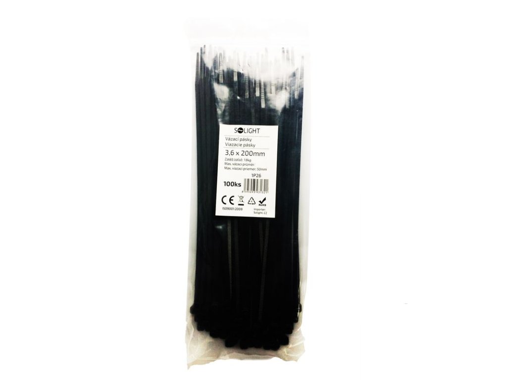 Solight vázací nylonové pásky, 3,6 x 200mm, černá, 100ks