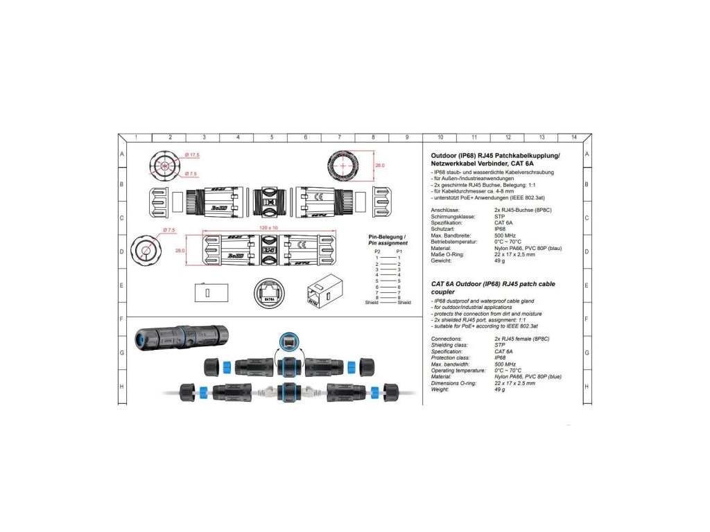Spojka RJ45 8P8C vodotěsná pro Cat.6A stíněnéDoplňkové parametry