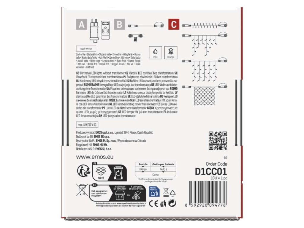 barva drátu: černá|barva světla: studená bílá|časovač: neuvádí se|dálkový ovladač: ne|délka přívodu: 10 cm|funkce: svítí|krytí: IP44|LED mezera: 10 cm|materiál: PVC|možnost propojení: ano|počet LED: 100|použití: venkovní i vnitřní|příkon: max. 5 W|prodejní obal: 1 ks, krabice|produkt: krápníky|pro výšku stromu: neuvádí se|rozměr: 2,5 × 0,9 m|tvar: klasický|typ napájení: síťový adaptér (není součástí balení)|velikost LED: 5 mm|vstupní napětí: 30 V DC|výstupní napětí: neuvádí se|záruční doba: 2 roky|životnost: 10 000 hodinDoplňkové parametry