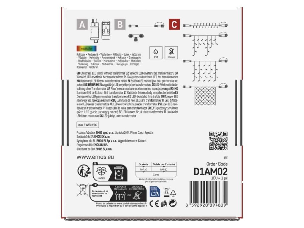 barva drátu: černá|barva světla: multicolor|časovač: neuvádí se|dálkový ovladač: ne|délka přívodu: 10 cm|funkce: svítí|krytí: IP44|LED mezera: 10 cm|materiál: PVC|možnost propojení: ano|počet LED: 50|použití: venkovní i vnitřní|příkon: max. 3 W|prodejní obal: 1 ks, krabice|produkt: řetěz|pro výšku stromu: neuvádí se|rozměr: 5 m|tvar: klasický|typ napájení: síťový adaptér (není součástí balení)|velikost LED: 5 mm|vstupní napětí: 30 V DC|výstupní napětí: neuvádí se|záruční doba: 2 roky|životnost: 10 000 hodinDoplňkové parametry