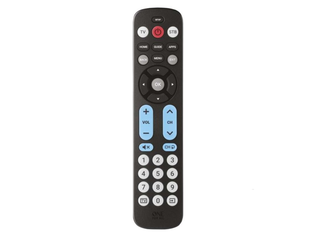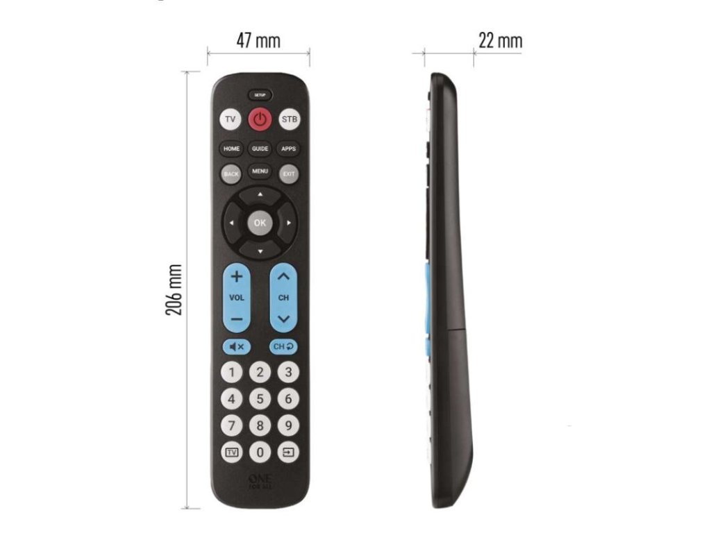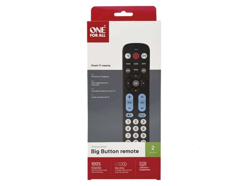 baterie součástí ovladače: ne|dosah: 15 m|funkce combi control: ano|funkce makro: ne|funkce učení: ano|garance podpory ovládání všech značek: ano|hmotnost: 220 g|modelová řada: Big Button|napájení: 2× AAA|nastavení a aktualizace přes www.simpleset.com: ne|paměť kódů po vyjmutí baterií: ano|počet možných ovládaných zařízení: 2|podsvícení kláves: ne|předprogramované kódy: ano|přímá volba zařízení: ano|přímé nastavení kódu: ano|prodejní obal: 1 ks, papírová krabička|rozměr: 40 × 17 × 150 mm|rychlý přístup k oblíbené aplikaci: ne|servisní aktualizace: ano|simple set nastavení: ano|určeno pro: TV, DVB-T, SAT, KAB TV, IPTV|vyhledání kódu: manuální|zámek hlasitosti: ano|změna nastavení ovládacího tlačítka zařízení: neDoplňkové parametry