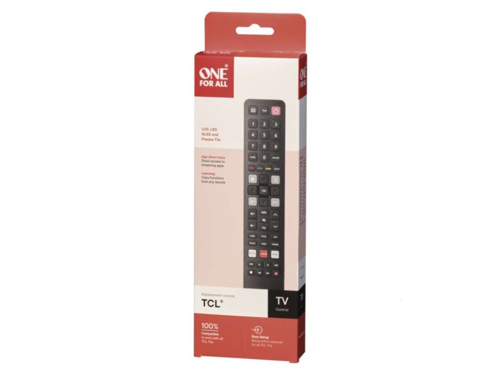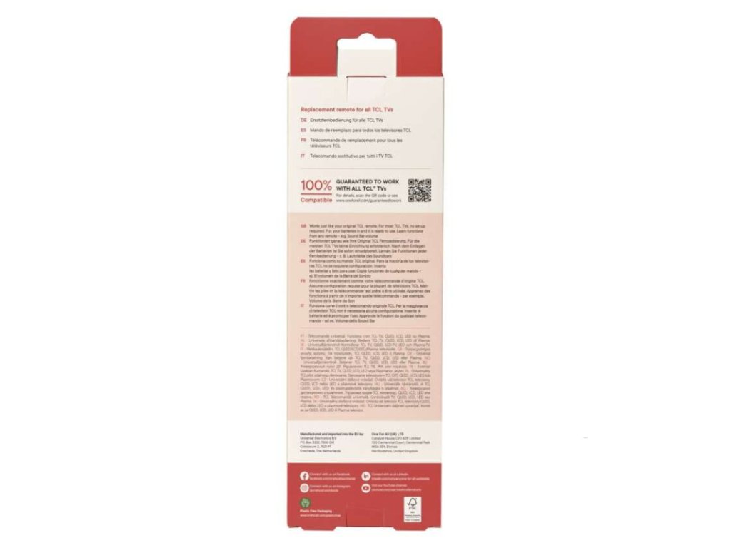 baterie součástí ovladače: ne|dosah: 15 m|funkce combi control: ne|funkce makro: ano|funkce učení: ano|garance podpory ovládání všech značek: neuvádí se|hmotnost: 195 g|modelová řada: speciální TV|napájení: 2× AAA|nastavení a aktualizace přes www.simpleset.com: neuvádí se|paměť kódů po vyjmutí baterií: ano|počet možných ovládaných zařízení: 2|podsvícení kláves: ne|předprogramované kódy: ano|přímá volba zařízení: ne|přímé nastavení kódu: ne|prodejní obal: 1 ks, papírová krabička|rozměr: 15 × 37 × 228 mm|rychlý přístup k oblíbené aplikaci: ano|servisní aktualizace: ano|simple set nastavení: ano – pro audio zařízení|určeno pro: TV TCL a audio zařízení|vyhledání kódu: donastavení kódu pro určitou řadu TCL|zámek hlasitosti: ne|změna nastavení ovládacího tlačítka zařízení: neDoplňkové parametry