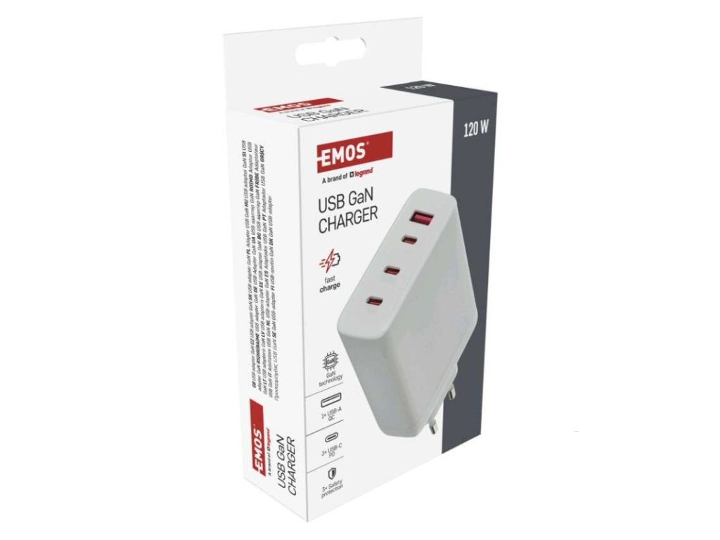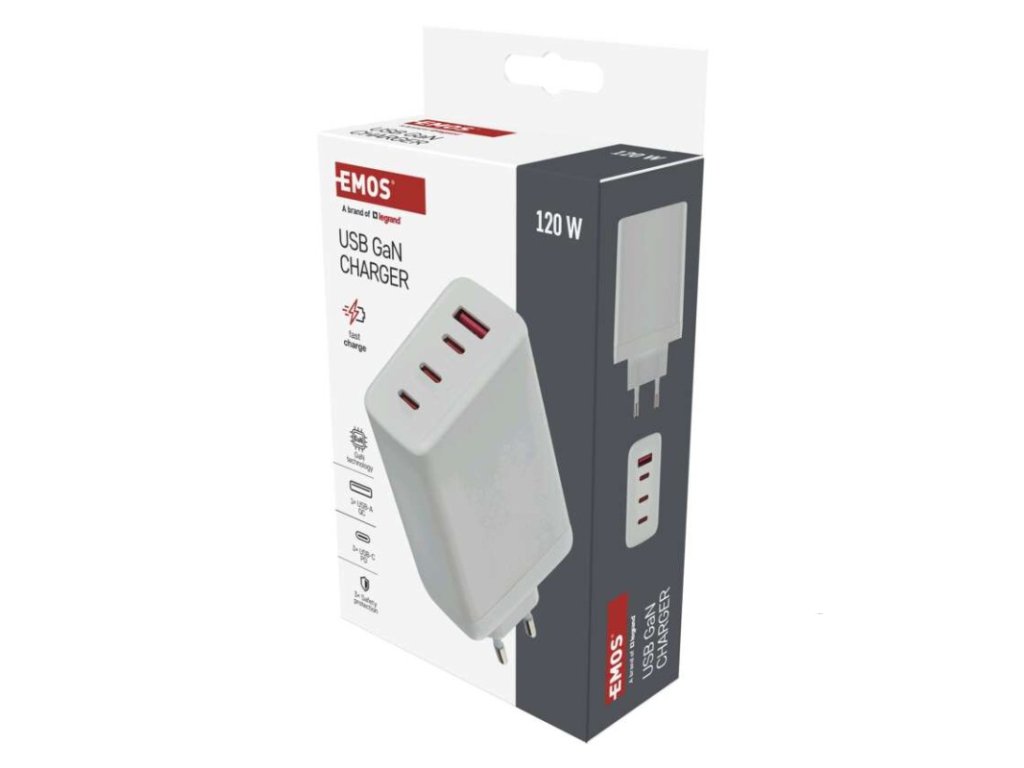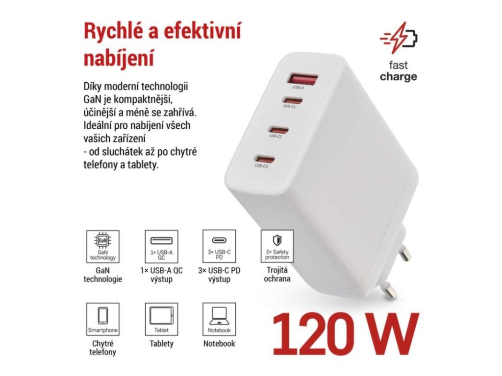 barva: bílá|funkce LED svítilny: neuvádí se|hmotnost: 222 g|kabel: ne|kapacita akumulátoru: neuvádí se|klidový odběr proudu: neuvádí se|LED indikace: ne|LED indikátor nabíjení: neuvádí se|LED indikátor stavu baterie: neuvádí se|max. výstup 1× USB: A: 5 V/3 A – 9 V/3 A – 10 V/2,25 A – 12 V/2,5 A – 20 V/1,5 A (30 W); C1/C2/C3: 5 V/3 A – 9 V/3 A – 12 V/3 A – 15 V/3 A – 20 V/5 A – 21 V/5 A (105 W)|max. výstup celkem: 120 W|max. zatížení – stálé: neuvádí se|max. zatížení – ve špičce: neuvádí se|nabíjení: fast|ochrana proti přetížení, přepětí a zkratu: ano|počet USB výstupů: 4|prodejní obal: 1 ks, papírová krabička|produkt: USB adaptér|rozměr: 57 × 107 × 24 mm|rozměr konektoru: neuvádí se|typ baterie: neuvádí se|typ napájení: neuvádí se|určeno pro: smartphone, tablet, notebook|vstupní napětí: 100–240 V~ 50/60 Hz|výstupní napětí: neuvádí se|výstupní proud: neuvádí seDoplňkové parametry