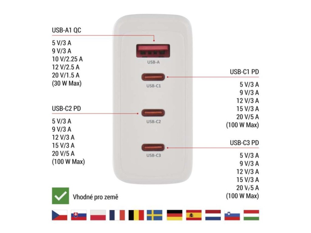 max. výstup 1× USB: | A: 5 V/3 A – 9 V/3 A – 10 V/2,25 A – 12 V/2,5 A – 20 V/1,5 A (30 W); C1/C2/C3: 5 V/3 A – 9 V/3 A – 12 V/3 A – 15 V/3 A – 20 V/5 A – 21 V/5 A (105 W) |