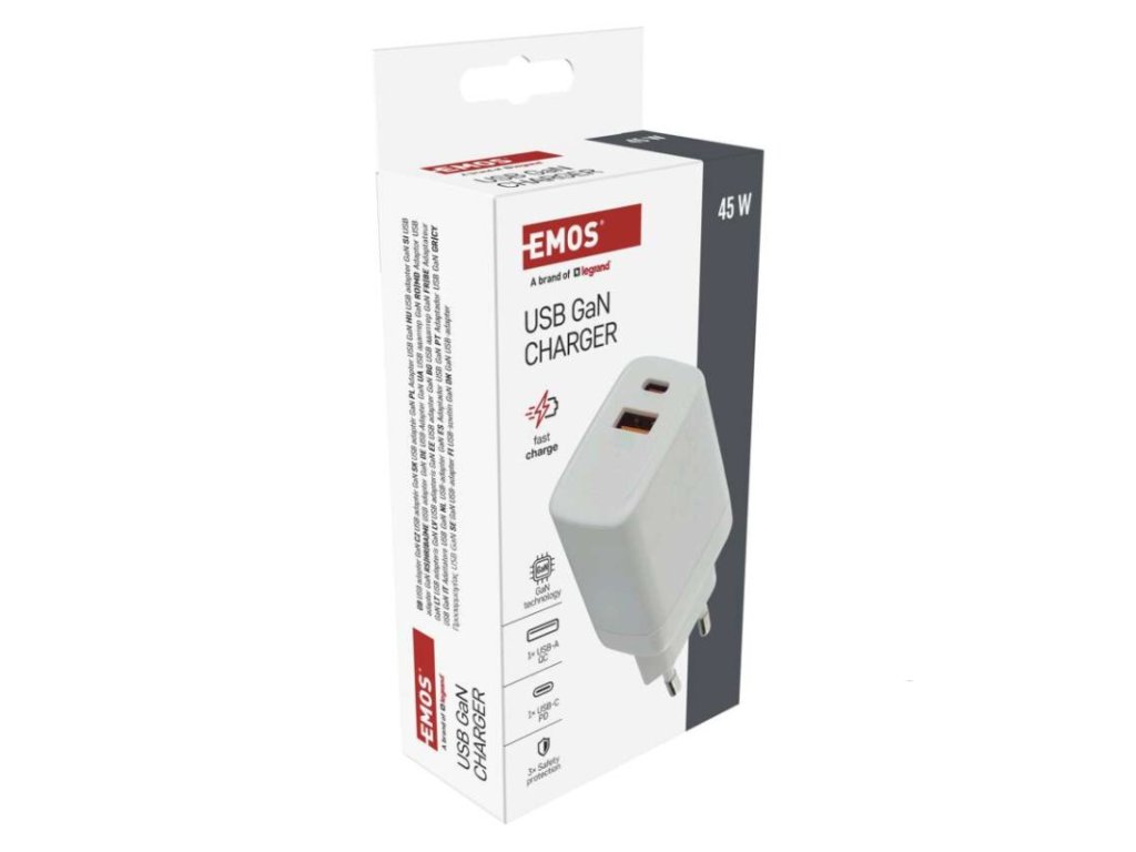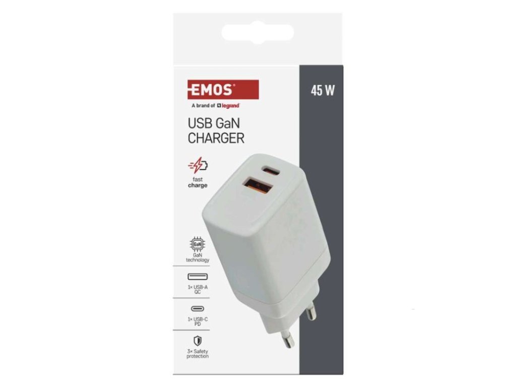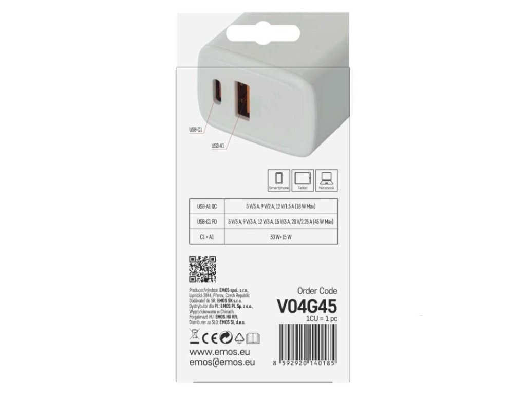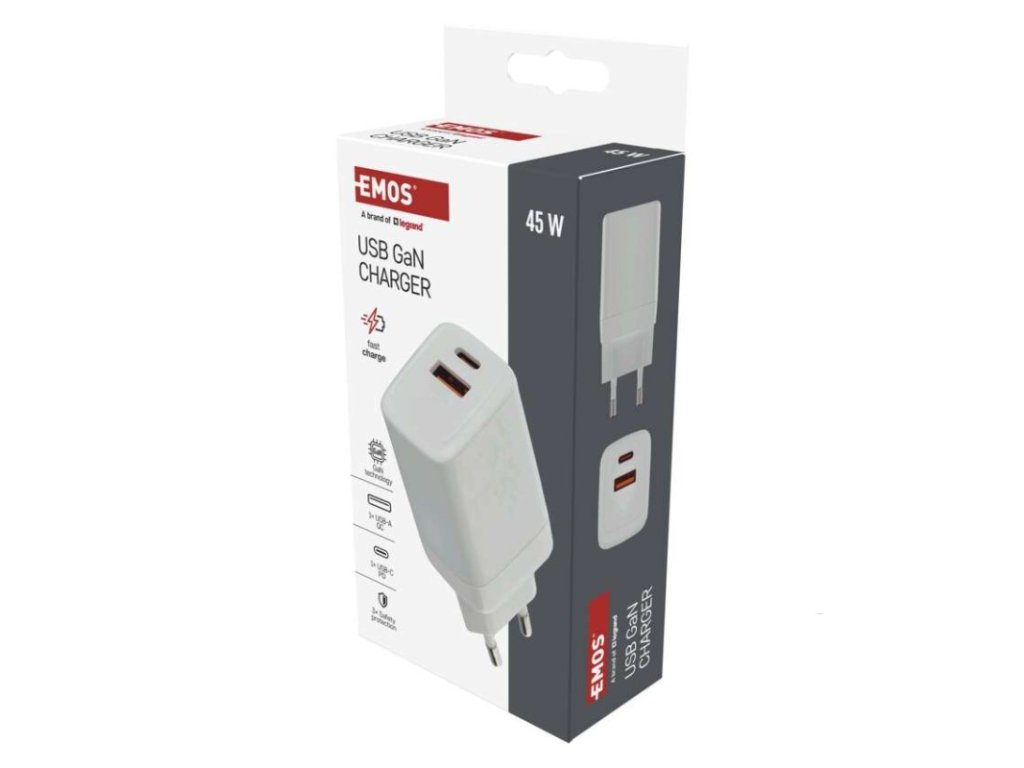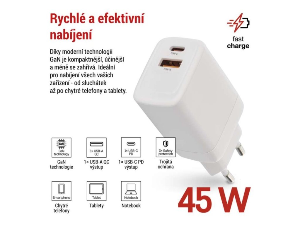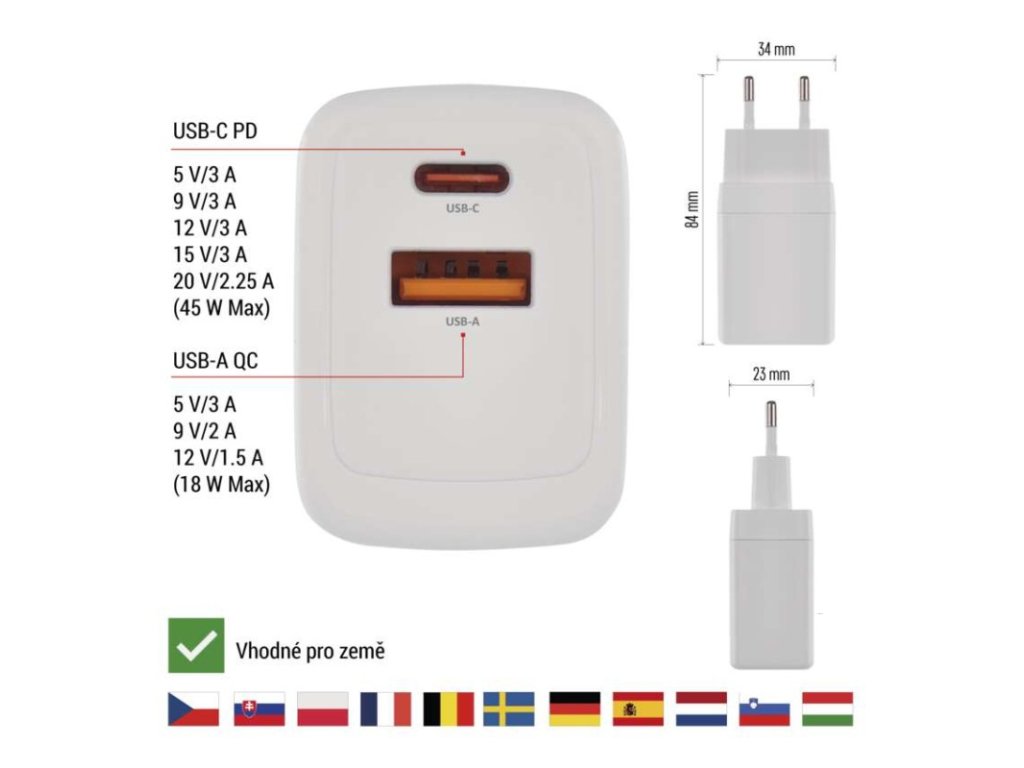 barva: bílá|funkce LED svítilny: neuvádí se|hmotnost: 79 g|kabel: ne|kapacita akumulátoru: neuvádí se|klidový odběr proudu: neuvádí se|LED indikace: ne|LED indikátor nabíjení: neuvádí se|LED indikátor stavu baterie: neuvádí se|max. výstup 1× USB: A: 5 V/3 A – 9 V/2 A – 12 V/1,5 A (18 W); C: 5 V/3 A – 9 V/3 A – 12 V/3 A – 15 V/3 A – 20 V/2,25 A (45 W)|max. výstup celkem: 45 W|max. zatížení – stálé: neuvádí se|max. zatížení – ve špičce: neuvádí se|nabíjení: fast|ochrana proti přetížení, přepětí a zkratu: ano|počet USB výstupů: 2|prodejní obal: 1 ks, papírová krabička|produkt: USB adaptér|rozměr: 34 × 84 × 23 mm|rozměr konektoru: neuvádí se|typ baterie: neuvádí se|typ napájení: neuvádí se|určeno pro: smartphone, tablet, notebook|vstupní napětí: 100–240 V~ 50/60 Hz|výstupní napětí: neuvádí se|výstupní proud: neuvádí seDoplňkové parametry