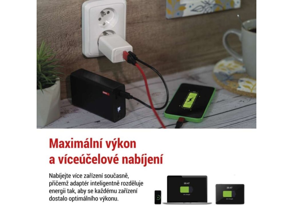 max. výstup 1× USB: | A: 5 V/3 A – 9 V/2 A – 12 V/1,5 A (18 W); C: 5 V/3 A – 9 V/3 A – 12 V/3 A – 15 V/3 A – 20 V/2,25 A (45 W) |