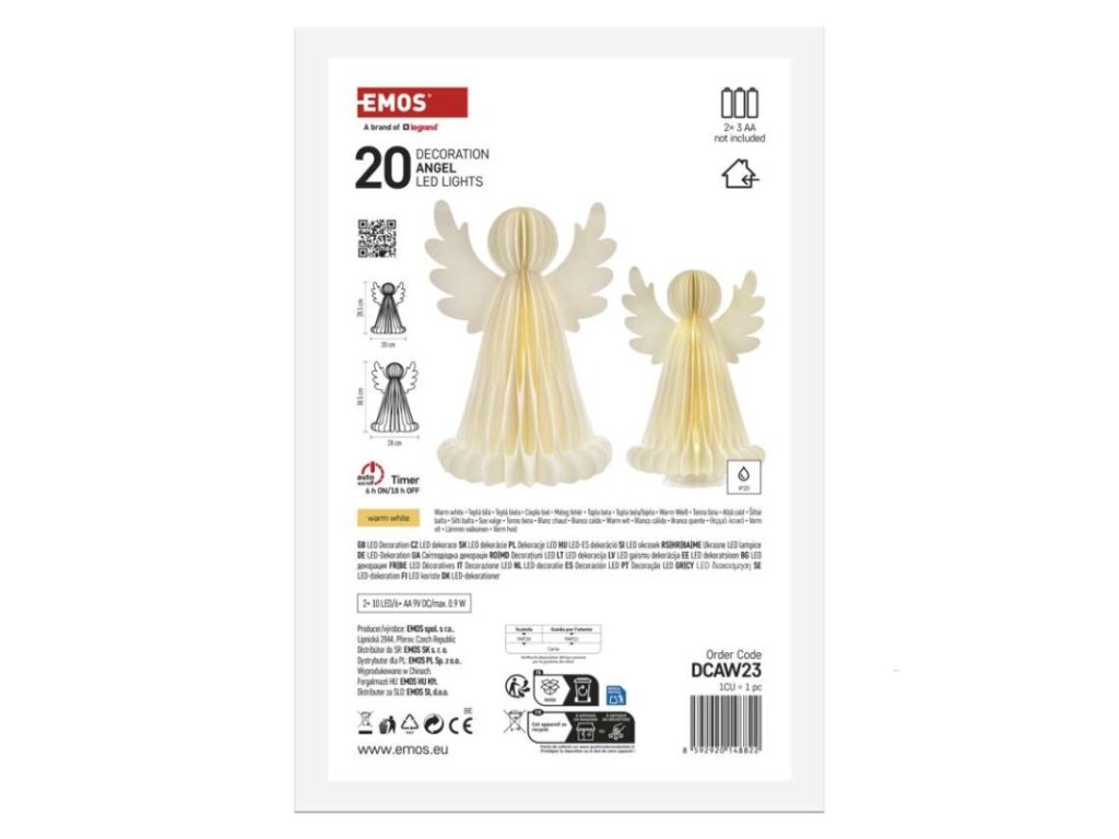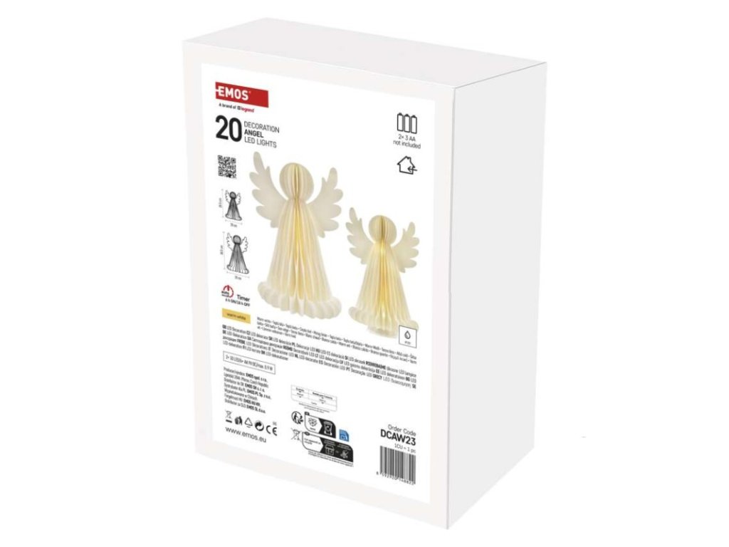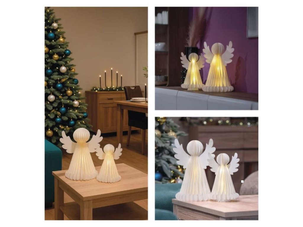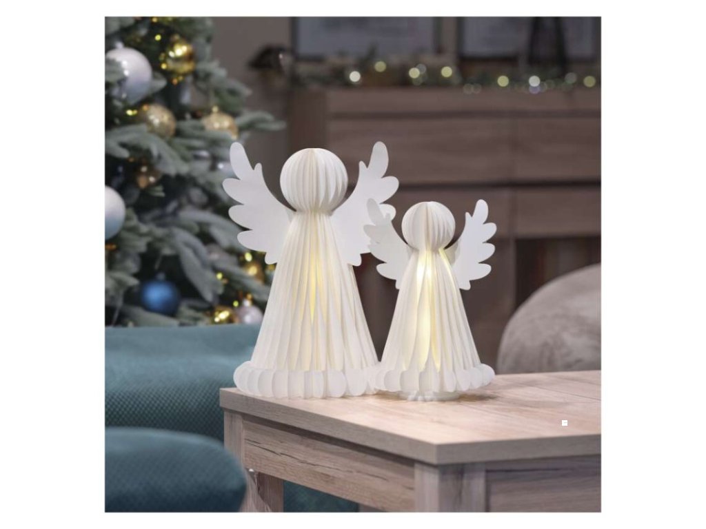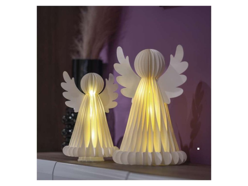 barva drátu: –|barva světla: teplá bílá|časovač: ano|dálkový ovladač: ne|délka přívodu: –|krytí: IP20|materiál: papír|počet LED: 2× 10|použití: vnitřní|příkon: 2× 0,45 W|prodejní obal: 1 ks, krabice|produkt: anděl|rozměr: 20/18/28,5 × 28/23/38,5 cm|typ napájení: baterie 6× AA (není součástí balení)|vstupní napětí: –|výstupní napětí: 2× 4,5 V DC|záruční doba: 2 roky|zdroj svícení: LED|životnost: 10 000 hodinDoplňkové parametry