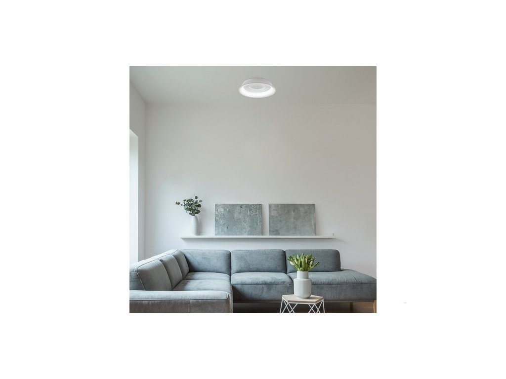 Inteligentní stropní svítidlo Veller v moderním stylu s vysokým jasem se doporučuje především do obývacího pokoje nebo ložnice. Skvělá volba pro ty, kteří hledají diskrétně vypadající svítilnu, která je všestranná a nabízí další funkce. Díky své velikosti a jasu dokáže Veller efektivně osvětlit i větší místnost. Bílý kovový model je doplněn bílým akrylovým stínítkem, díky kterému Veller splyne s typicky světlou barvou stropu. Lampa má zabudovaný LED světelný zdroj energetické třídy G o výkonu 36 W, svítivostí 2500 lumenů se stínítkem, 3000 lumenů bez stínítka a se skutečně výjimečnou životností: až 36 000 hodin! Teplotu barev inteligentního modelu lze nastavit pomocí přepínače DIP: světlo můžete nastavit na 3000, 4000 nebo 6000 K, t. j. teplé, přirozené nebo studené bílé světlo. Rozměry stropního svítidla Veller jsou tyto: průměr 430 mm, vzdálenost od stropu 80 mm, instalační průměr 335 mm.