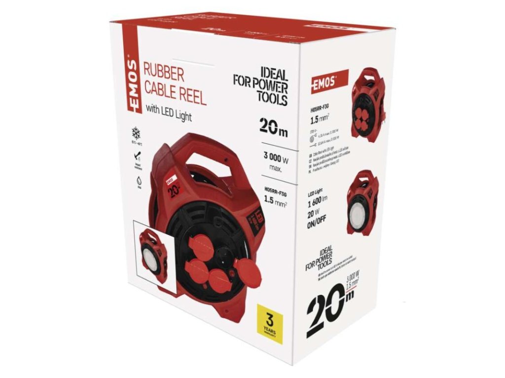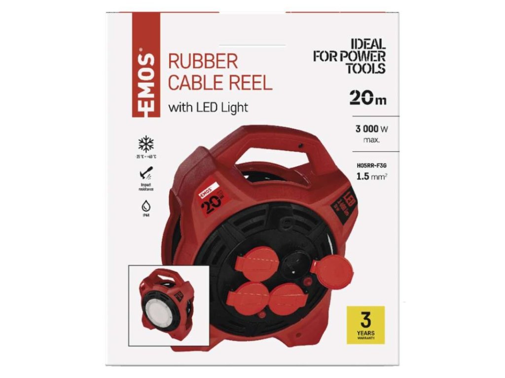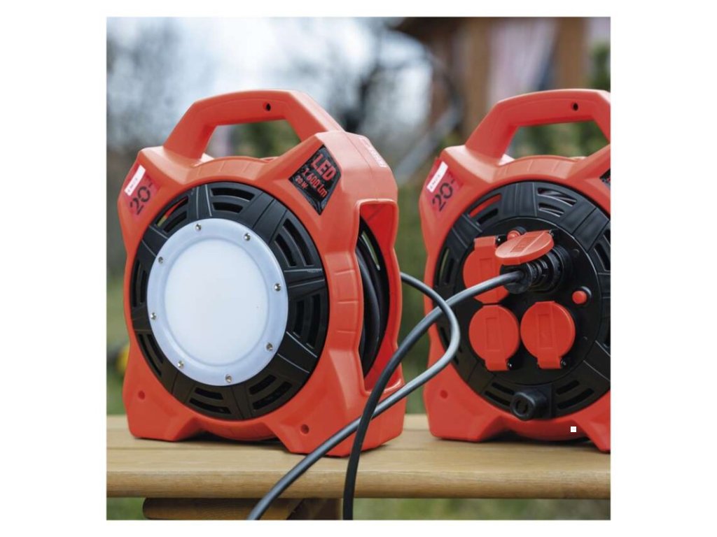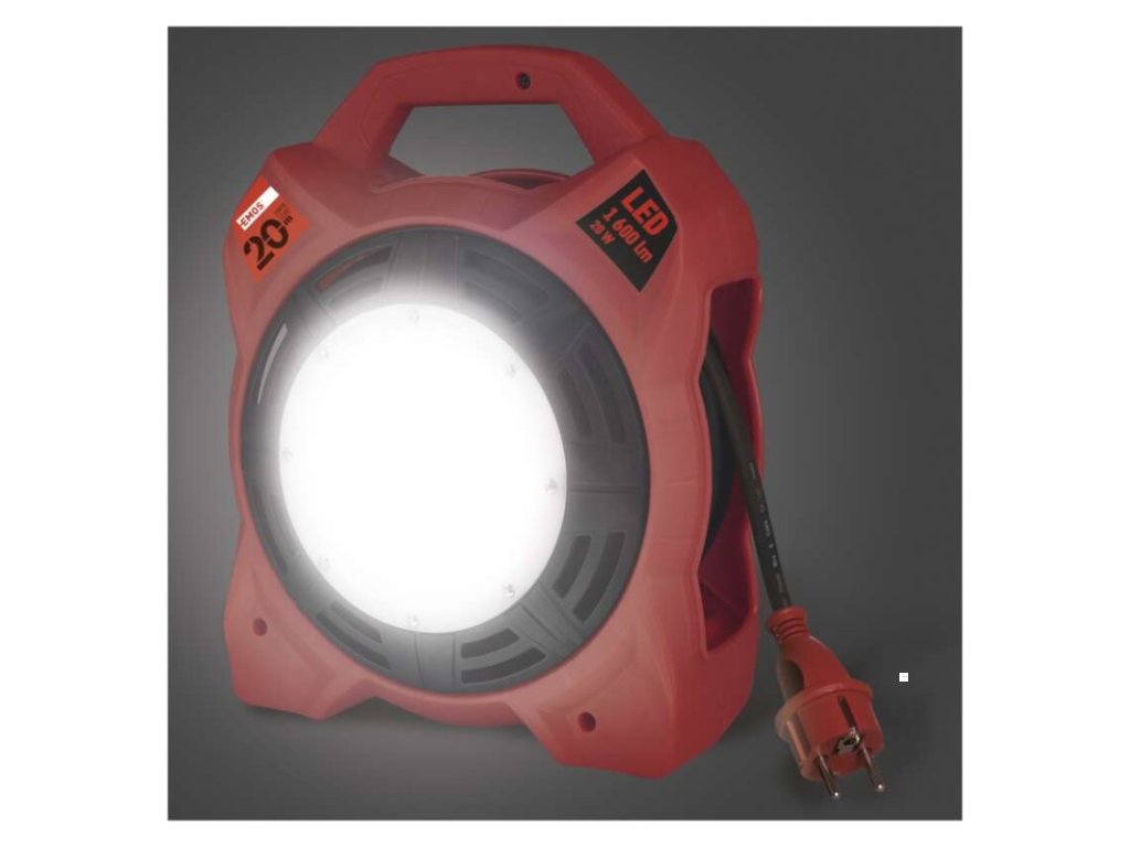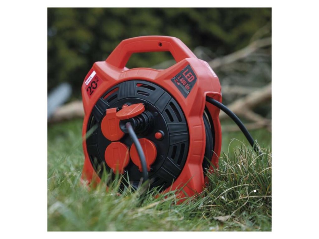 barva kabelu: červená/černá|další funkce: LED reflektor 20 W/1 600 lm/6 500 K|délka: 20 m|dětské clonky: ne|hmotnost: neuvádí se|krytí: IP44|max. zatížení navinutého: 4,35 A max./1 000 W|max. zatížení rozvinutého: 13,04 A max./3 000 W|napětí: 230 V~|počet zásuvek: 4|prodejní obal: 1 ks, krabice|produkt: buben s pohyblivým středem|proud: 13 A|průřez vodiče: 1,5 mm²|rozměr: 247 × 157 × 310 mm|tepelná pojistka: ano|typ izolace: guma|vodič: H05RR-F3G|záruční doba: 3 rokyDoplňkové parametry