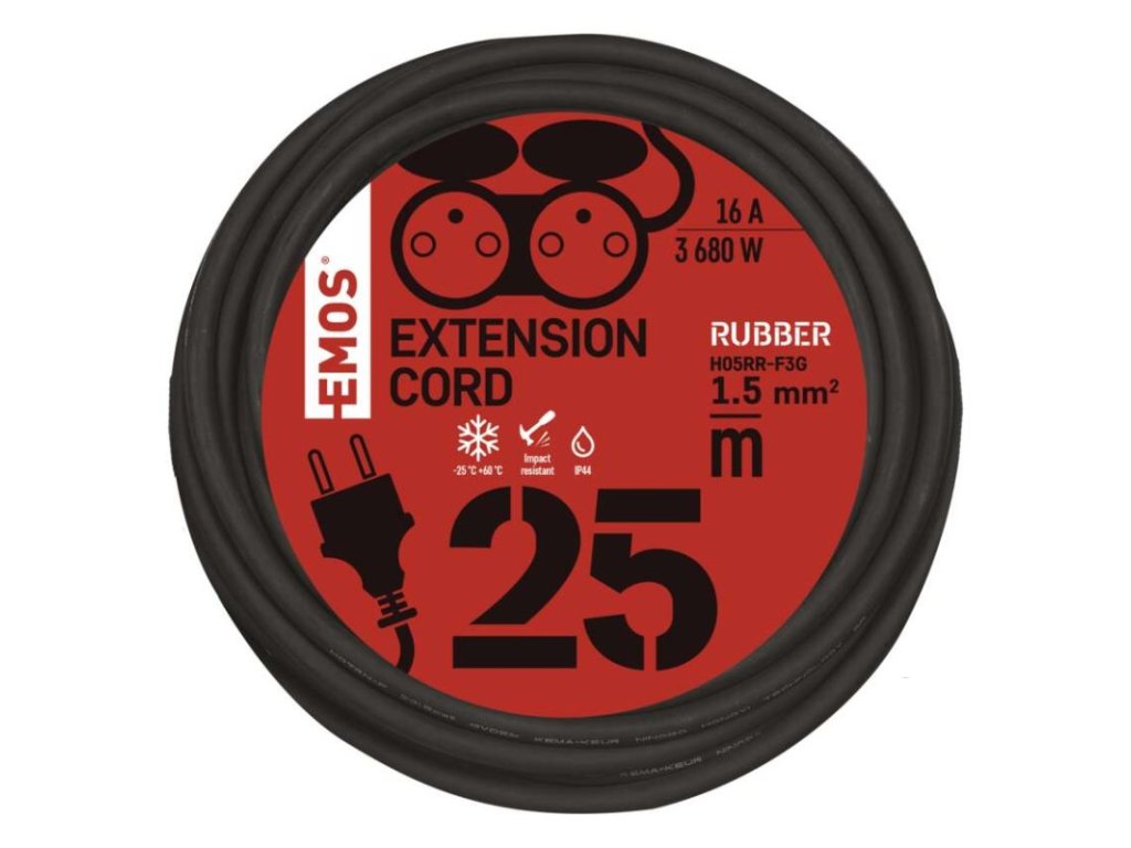 barva kabelu: černá|další funkce: ne|délka: 25 m|dětské clonky: ano|hmotnost: neuvádí se|krytí: IP44|max. zatížení navinutého: neuvádí se|max. zatížení rozvinutého: 16 A max./3 680 W|napětí: 230 V~|počet zásuvek: 2|prodejní obal: 1 ks, sáček|produkt: prodlužovací přívod – spojka|proud: 16 A|průřez vodiče: 1,5 mm²|rozměr: neuvádí se|tepelná pojistka: ne|typ izolace: guma|vodič: H05RR-F3G|záruční doba: 2 rokyDoplňkové parametry