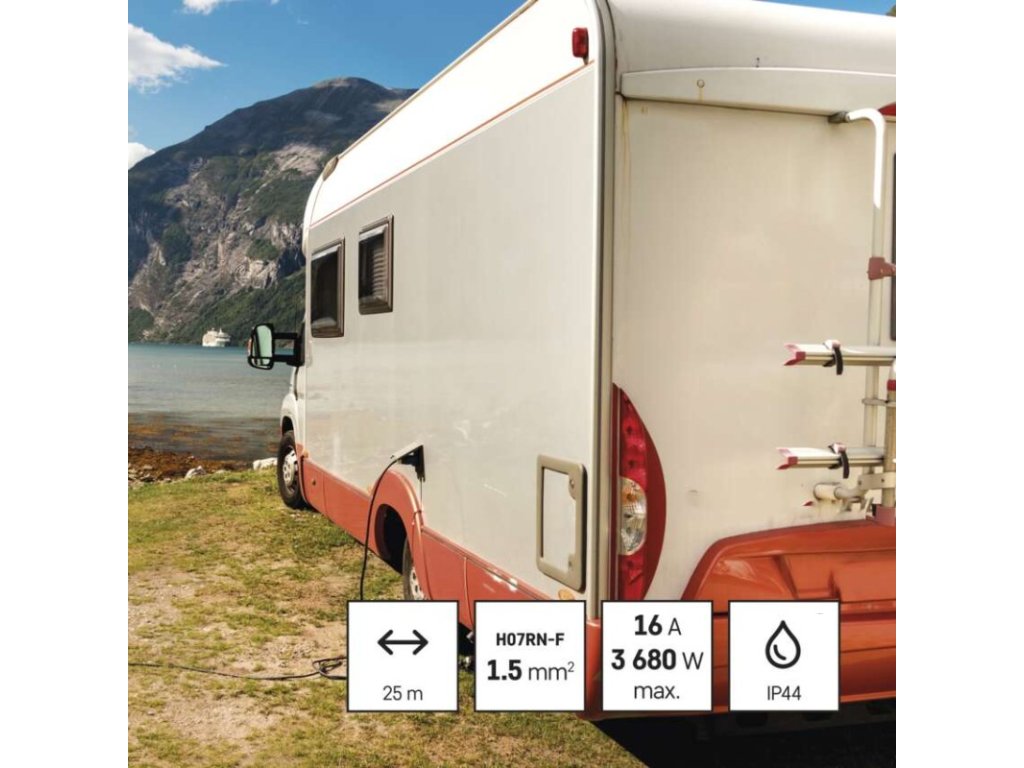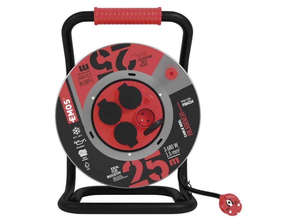 barva kabelu: černá|další funkce: vodící oko, brzda cívky|délka: 25 m|dětské clonky: ne|hmotnost: neuvádí se|krytí: IP44|max. zatížení navinutého: 4,35 A max./1 000 W|max. zatížení rozvinutého: 16 A max./3 680 W|napětí: 230 V~|počet zásuvek: 4|prodejní obal: 1 ks, krabice|produkt: buben s pohyblivým středem|proud: 16 A|průřez vodiče: 1,5 mm²|rozměr: 285 mm|tepelná pojistka: ano|typ izolace: guma/neopren|vodič: H07RN-F|záruční doba: 5 letDoplňkové parametry