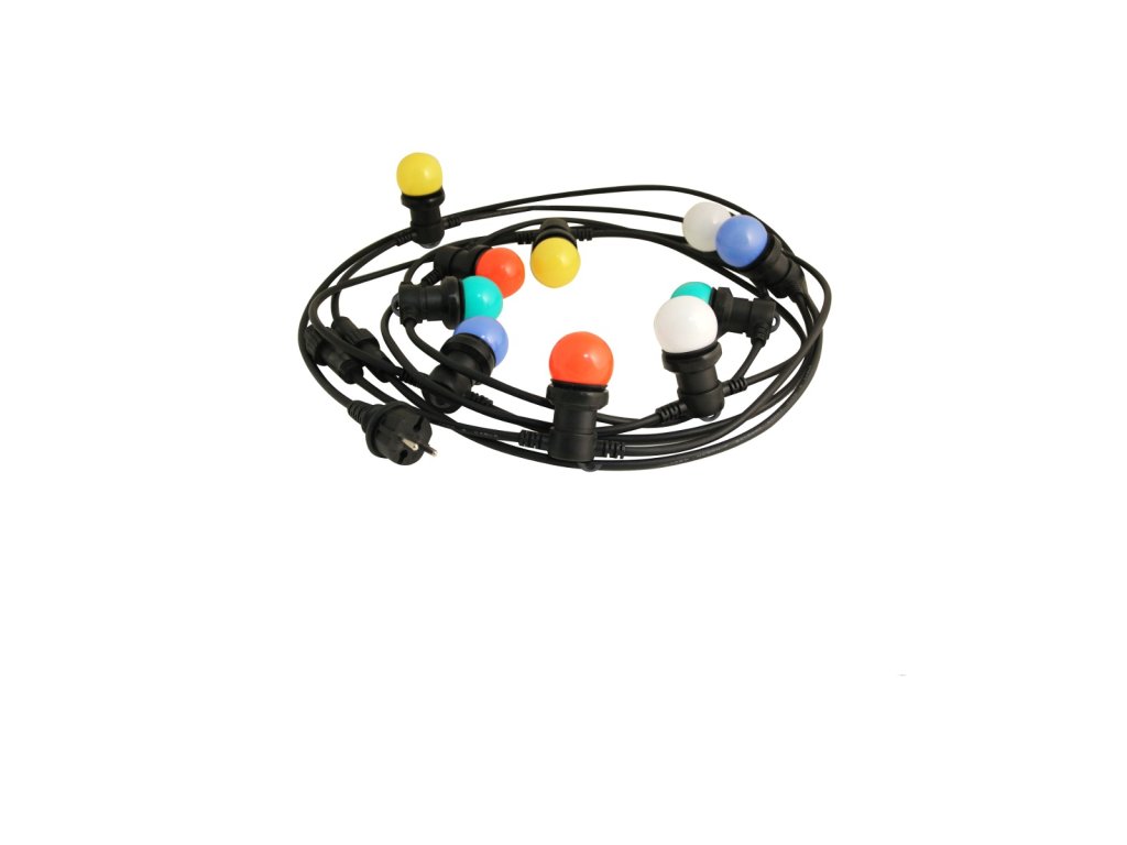 Venkovní světelný řetěz s 10 barevnými žárovkami vhodná např. pro oslavu na zahradě.Rozšiřitelný.Technická charakteristika: E27 žárovky, 1W, kabel 1,5m + 4,5 m H05RN-F2x1mm2, váha 1 kgDoplňkové parametry