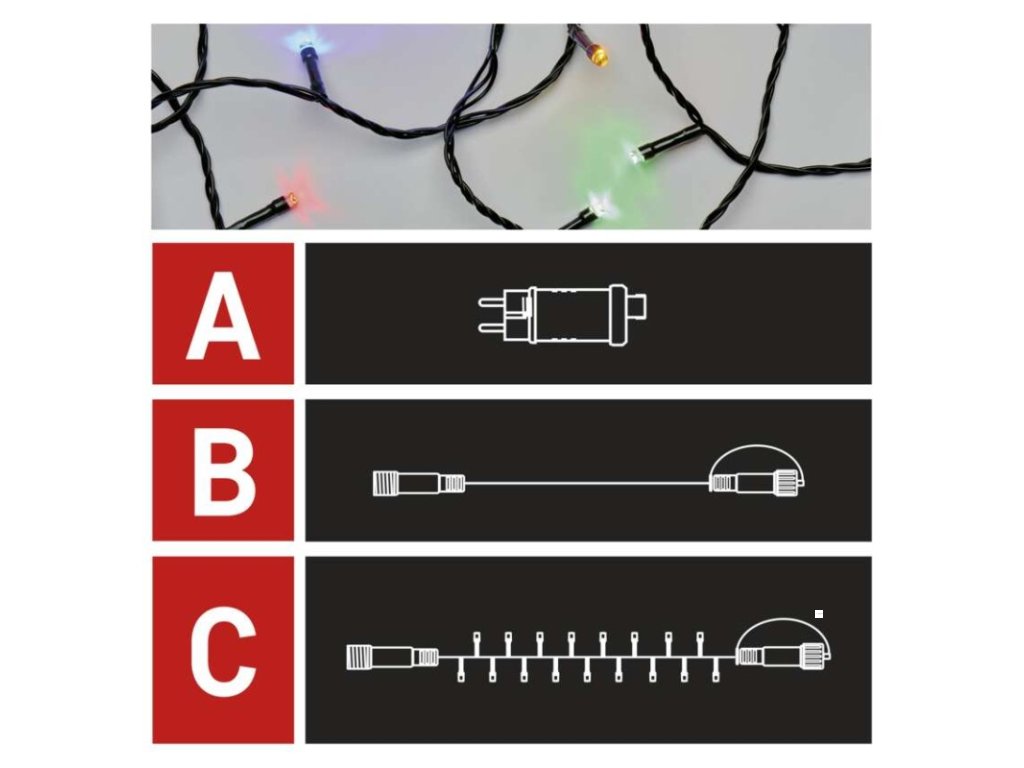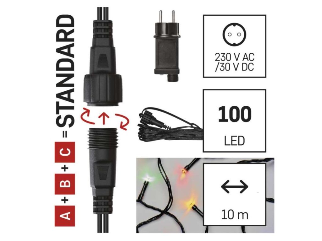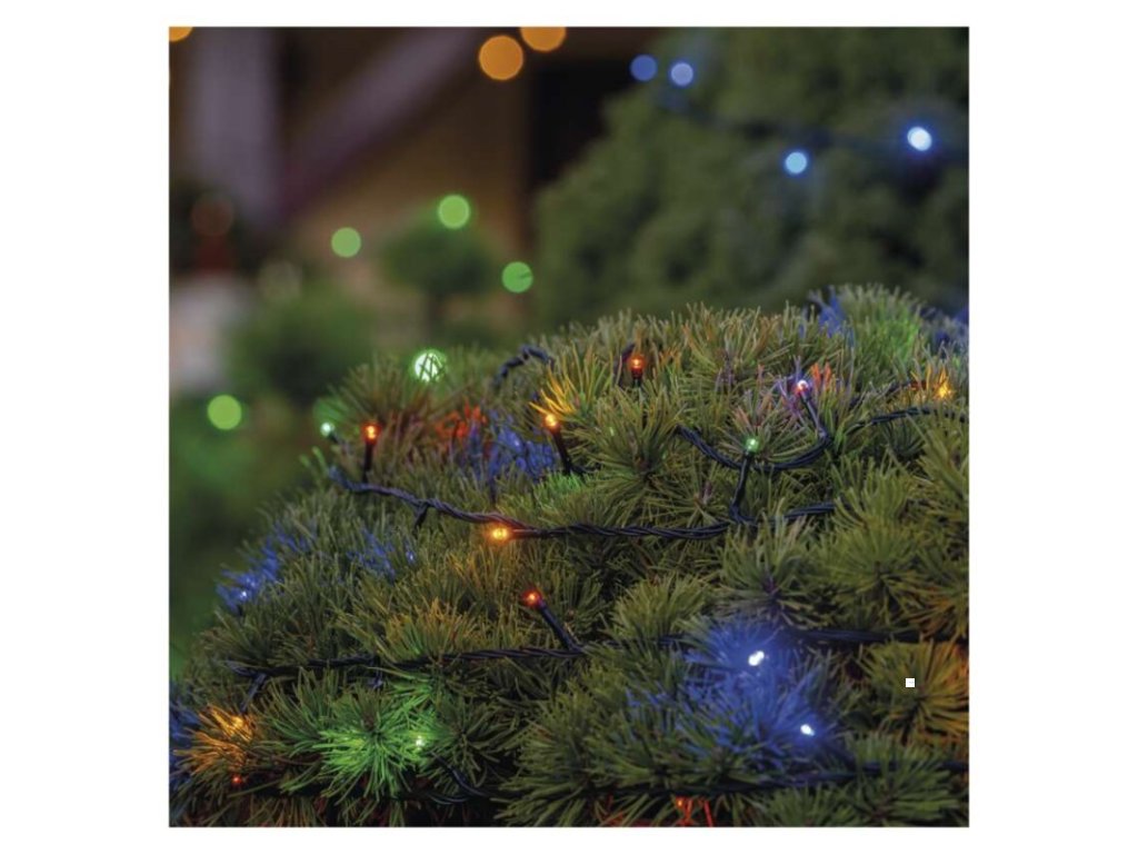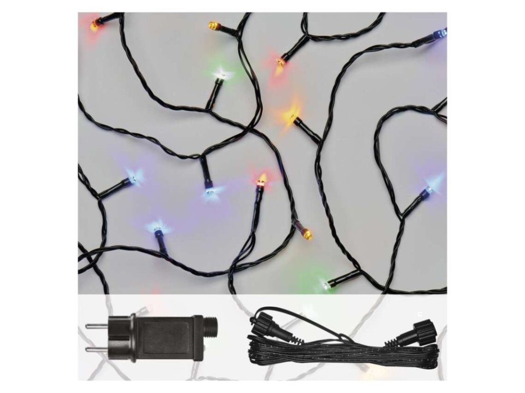 barva drátu: černá|barva světla: multicolor|časovač: ano|dálkový ovladač: ne|délka přívodu: 5 m|funkce: svítí|krytí: IP44|LED mezera: 10 cm|materiál: PVC|možnost propojení: ano|počet LED: 100|použití: venkovní i vnitřní|příkon: max. 12 W|prodejní obal: 1 ks, krabice|produkt: spojovací řetěz s napájecím zdrojem|pro výšku stromu: neuvádí se|rozměr: 10 m|tvar: klasický|typ napájení: síťový adaptér|velikost LED: 5 mm|vstupní napětí: 230 V AC|výstupní napětí: 30 V DC|záruční doba: 2 roky|životnost: 10 000 hodinDoplňkové parametry