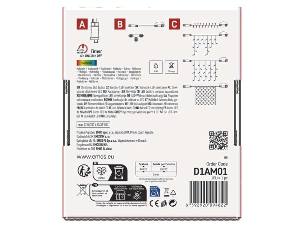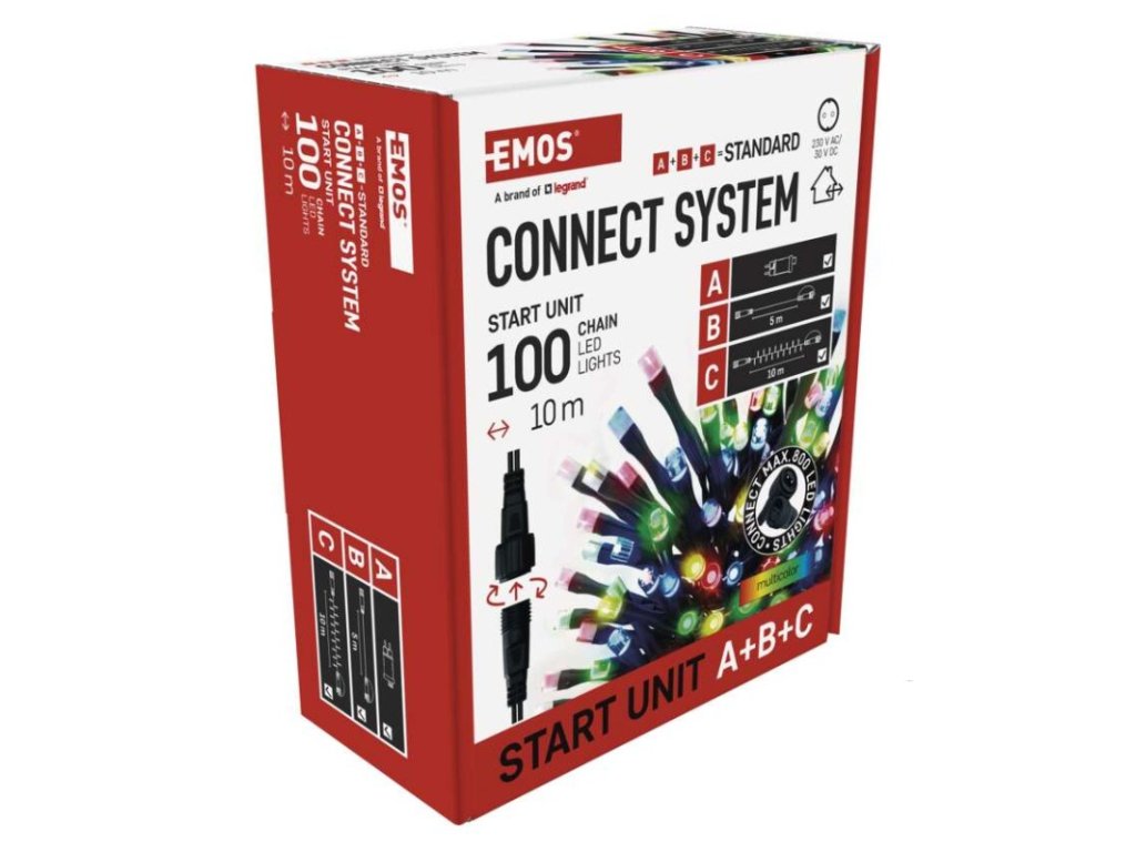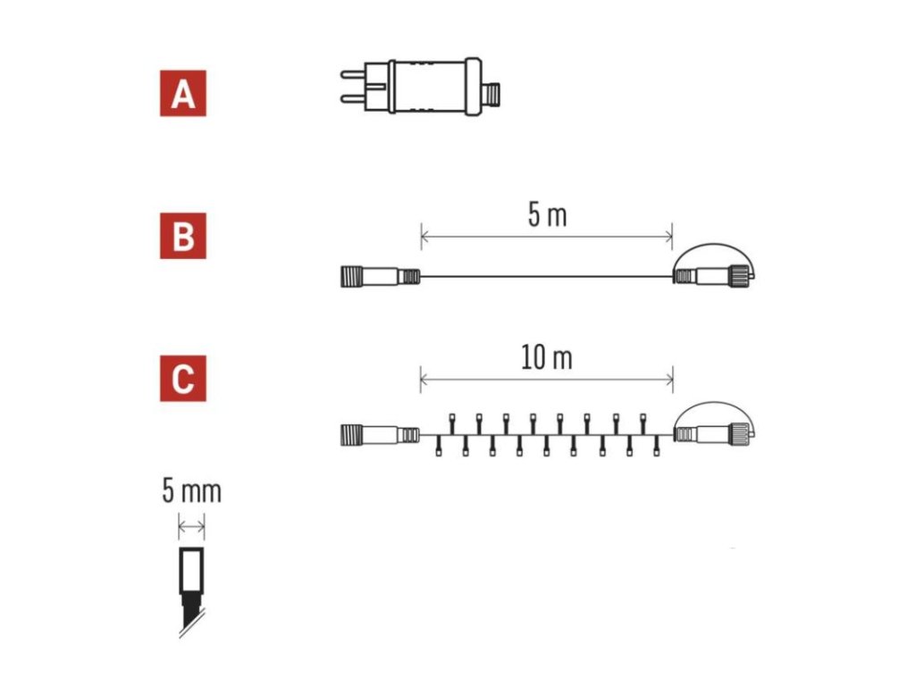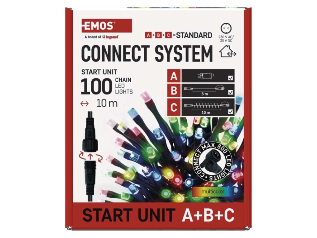 barva drátu: černá|barva světla: multicolor|časovač: ano|dálkový ovladač: ne|délka přívodu: 5 m|funkce: svítí|krytí: IP44|LED mezera: 10 cm|materiál: PVC|možnost propojení: ano|počet LED: 100|použití: venkovní i vnitřní|příkon: max. 12 W|prodejní obal: 1 ks, krabice|produkt: spojovací řetěz s napájecím zdrojem|pro výšku stromu: neuvádí se|rozměr: 10 m|tvar: klasický|typ napájení: síťový adaptér|velikost LED: 5 mm|vstupní napětí: 230 V AC|výstupní napětí: 30 V DC|záruční doba: 2 roky|životnost: 10 000 hodinDoplňkové parametry