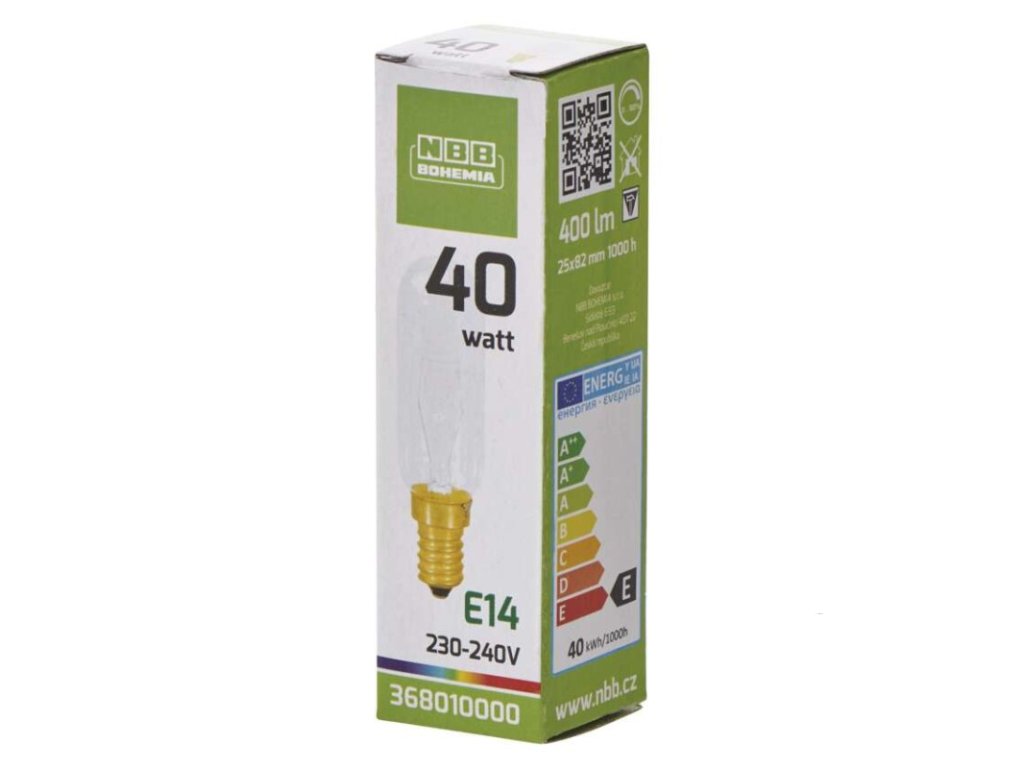 energetická třída: neuvádí se|energetická třída (od 1.9.2021): neuvádí se|napětí: 230 V|patice (uchycení žárovky): E14|příkon: 40 W|prodejní obal: 1 ks, krabice|produkt: žárovka do digestoře|rozměr: 25 × 82 mm|světelný tok: 400 lm|teplota: neuvádí se|typ: žárovka do digestoře|záruční doba: 2 rokyDoplňkové parametry