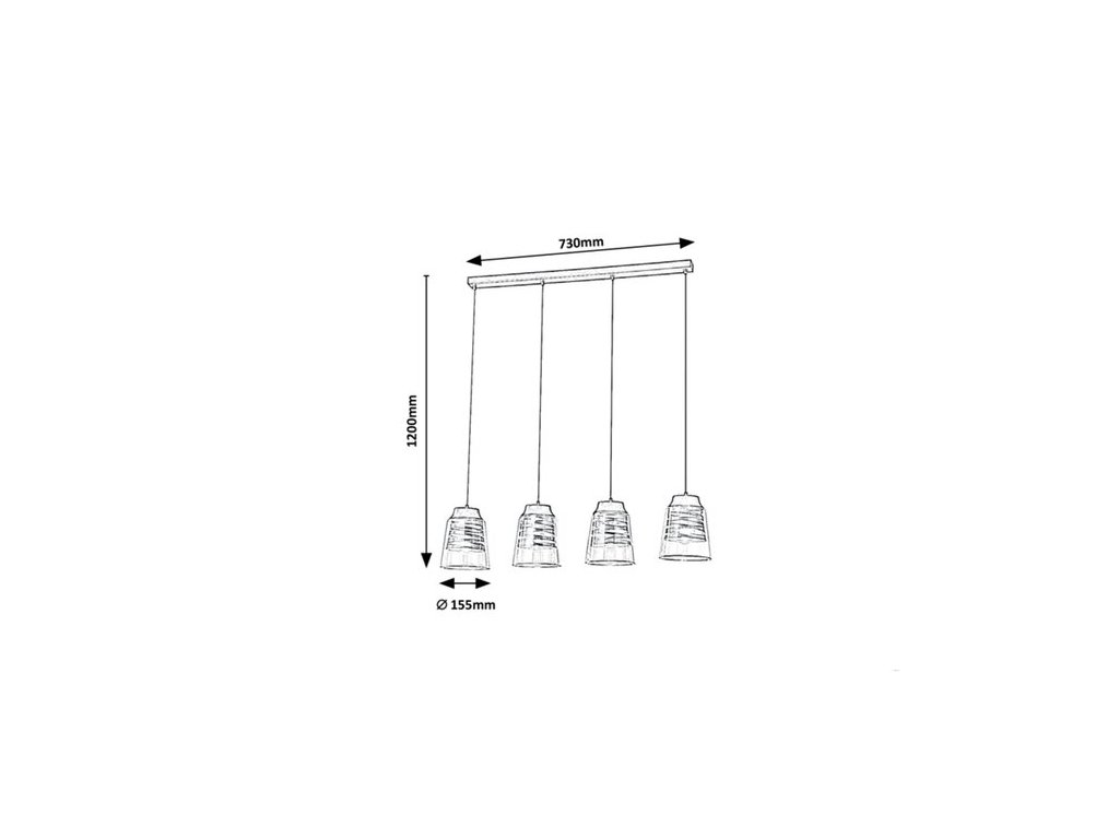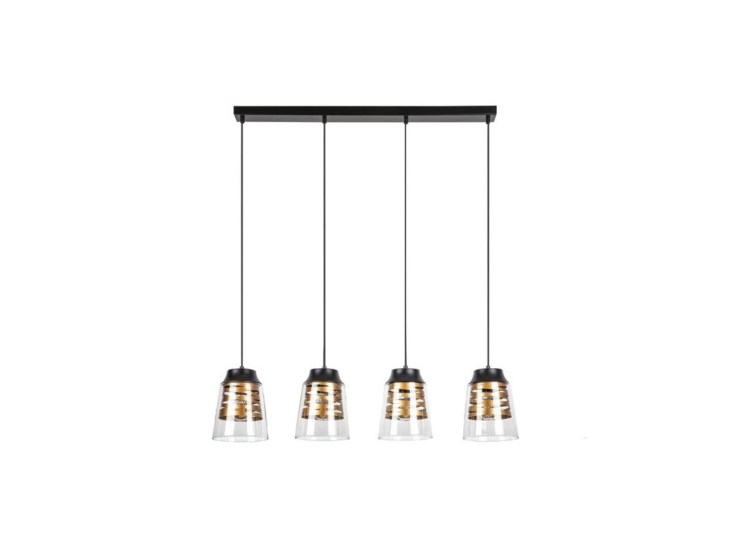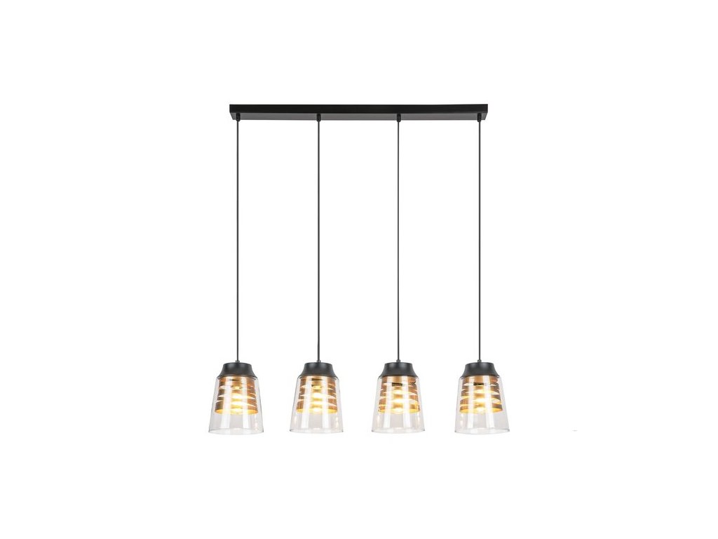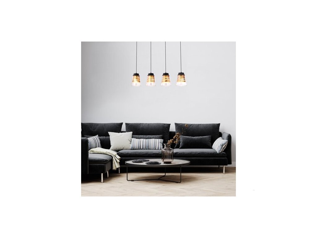 Moderní závěsné svítidlo Zenaida se 4 žárovkami bude útulným doplňkem k zařízení vašeho moderního obývacího pokoje, ložnice, jídelny nebo dokonce kuchyně. Matné černé svítidlo vyrobené z kovu je doplněno průhlednými skleněnými stínítky, z nichž každý má uvnitř světelný zdroj, který má zlatou stužkovou výzdobu. Toto závěsné svítidlo lze připevnit na strop pomocí dlouhého čtvercového ozdobného podstavce. Hlavy svítidla jsou spojeny s ozdobnou paticí textilními kabely. Každá hlava svítidla Zenaida je jako velkolepá a lahodná kávová specialita naplněna ve sklenici s dvojitým sklem, která visí vzhůru nohama na stěně. Tento model je možné použít se čtyřmi žárovkami, z nichž každá má výkon až 60W. Typ patice je E27. Pokud chcete vylepšit intimní a útulnou atmosféru, vyberte si pro toto svítidlo teplé bílé světelné zdroje. Rozměry závěsného svítidla se 4 žárovkami jsou tyto: šířka 730 mm, průměr každého stínítka je 155 mm, vzdálenost od stropu 1 200 mm. Tento model se dodává bez světelných zdrojů.
